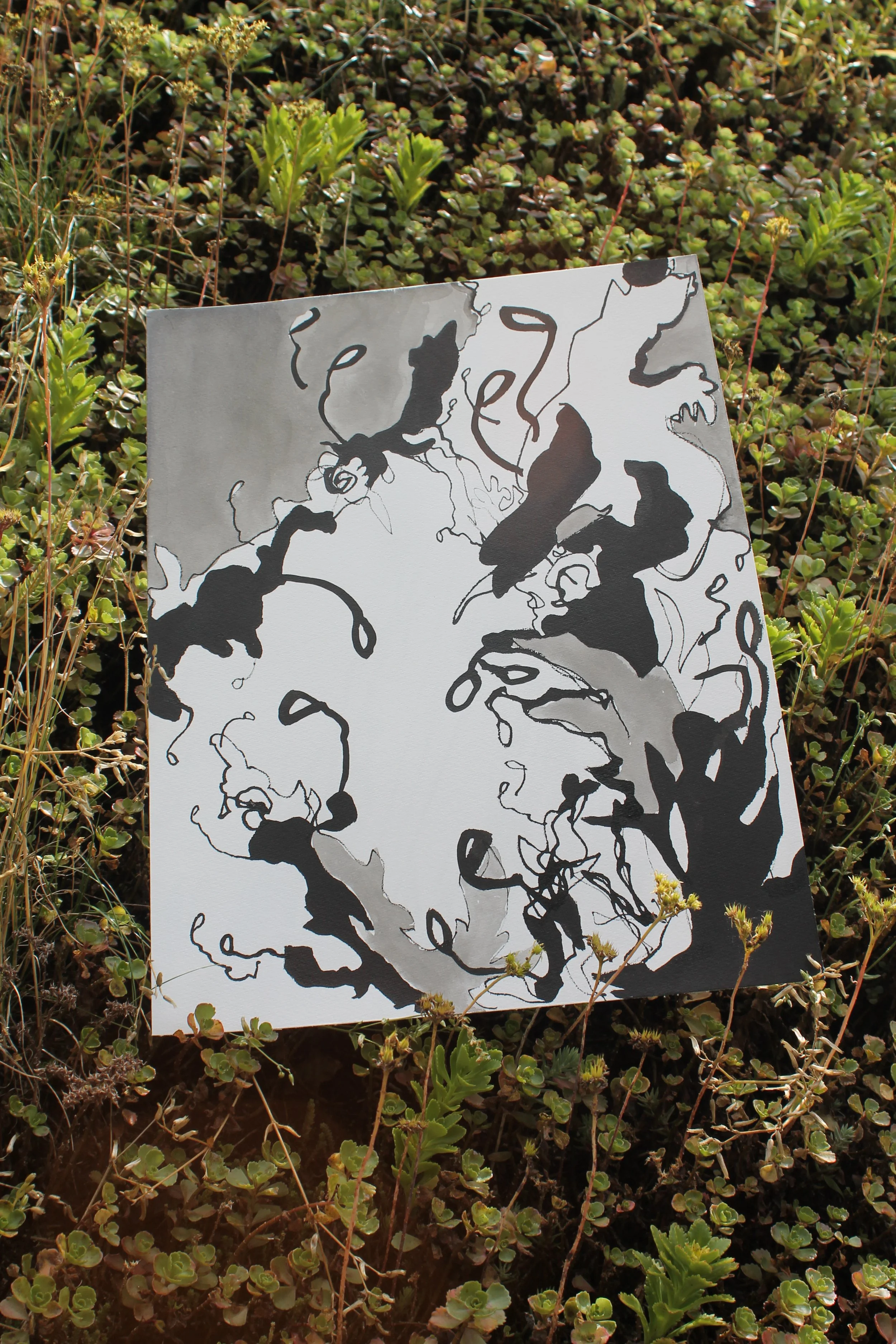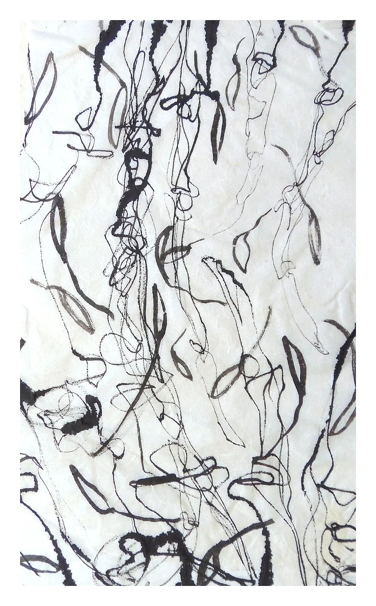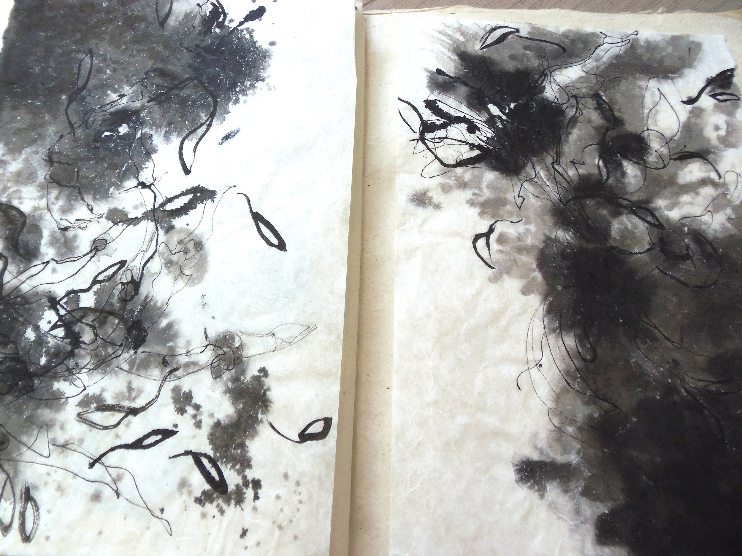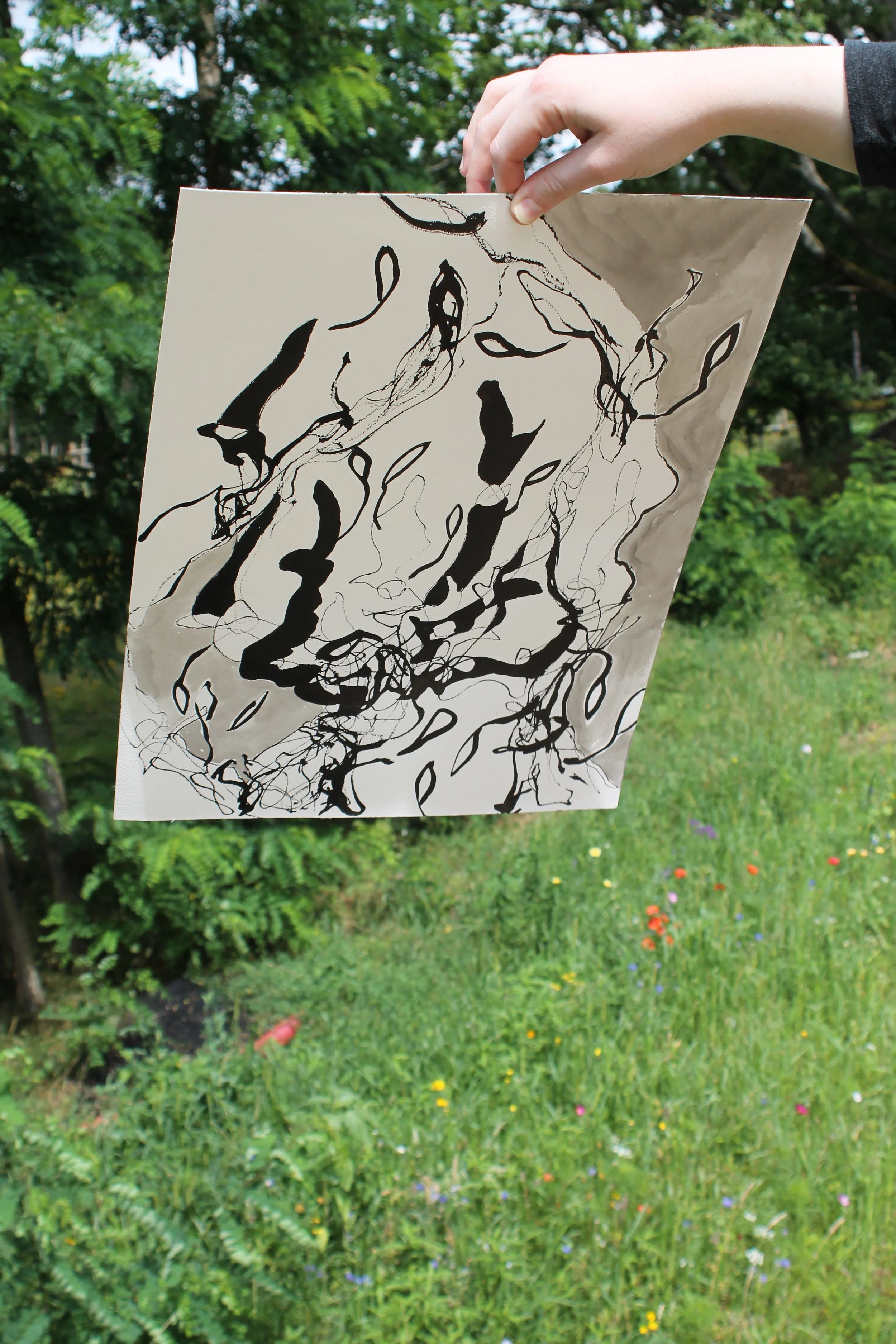 Ces créations mettent en parallèles la plasticité du geste de l’artiste et de la plante. Au fur et à mesure que mes gestes s’émancipaient de leur profond conditionnement et qu’ils échappaient à la mécanique routinière, de nouvelles formes de plantes se manifestaient sur la feuille de papier, poussant de part et d’autres du miroir de l’Univers.