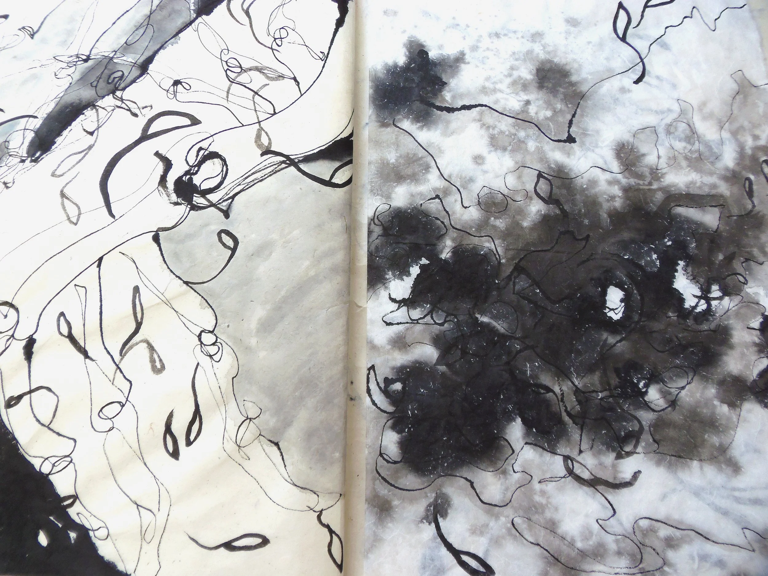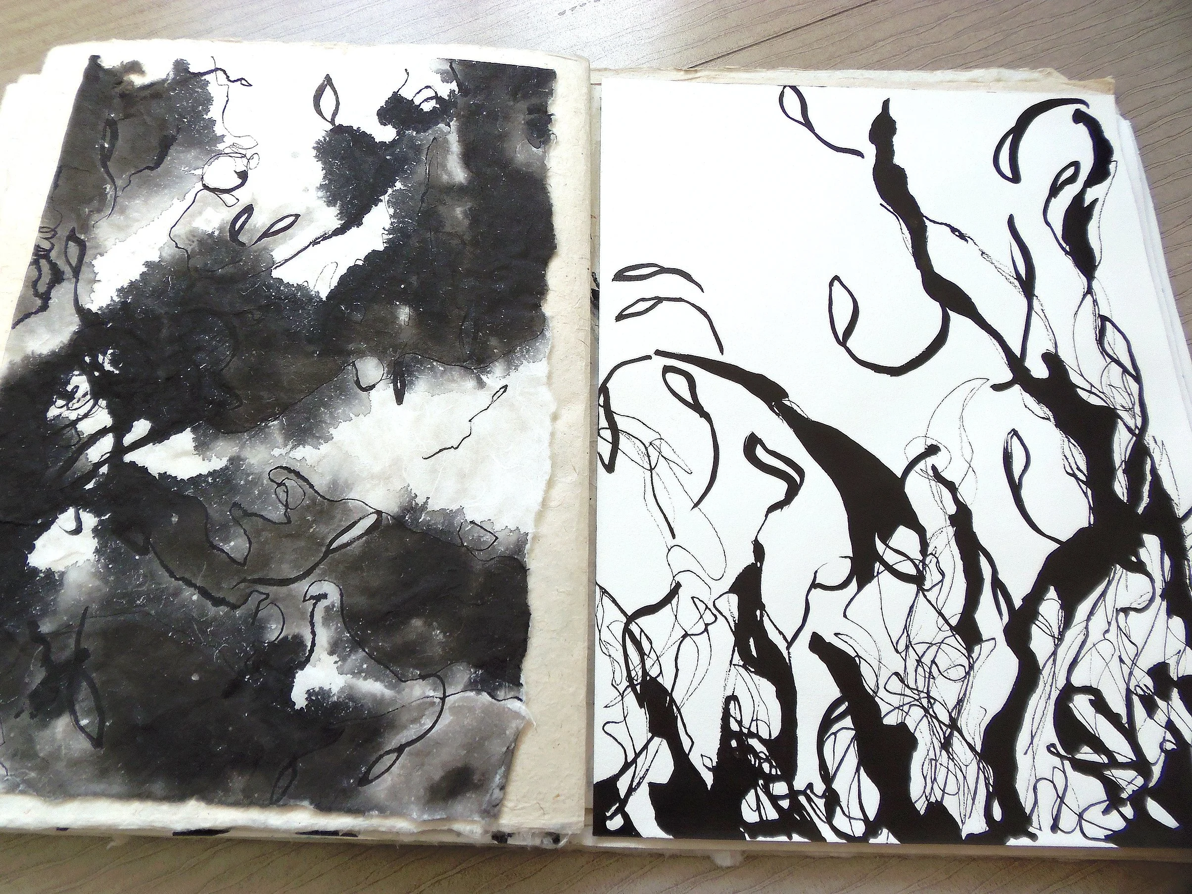 Tâches, nervures, ex-croissances de l’encre de Chine au contact de la feuille.